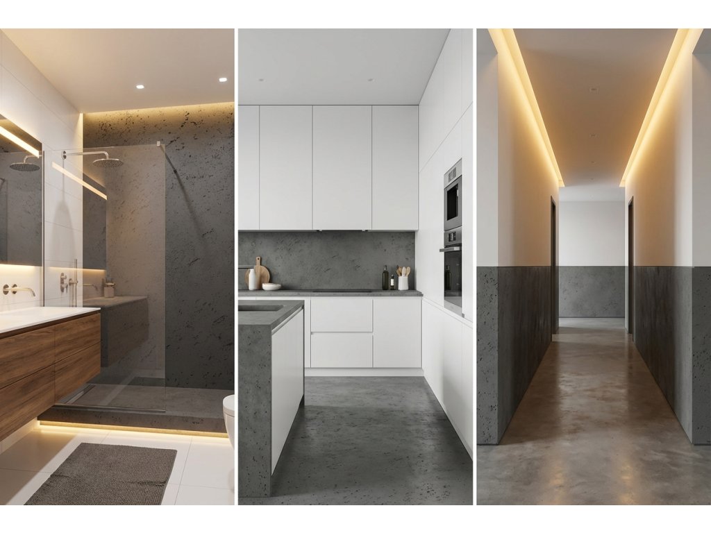 Dekorativní a funkční stěrka vhodná do interiéru i exteriéru. Betonové stěrky nejsou pouze krásné designové řešení, ale i velice odolné a funkční řešení pro Váš domov. V interiéru lze využít tento materiál například na stávající obklady v kuchyni, na schodiště, v koupelně nebo přímo ve sprchovém koutě. Ve sprchovém koutě je potřeba stěrku opatřit finálním lakem vhodným pro stále zatížení vodou. Při aplikaci stěrky na vodorovnou plochu v interiéru doporučujeme povrch opatřit lakem epoxidovým či polyuretanovým. V exteriéru lze využít stěrku na veškeré svislé plochy jako jsou fasády domů, ploty ze ztraceného bednění, opěrné zídky, komíny, soklové části domů i krby.